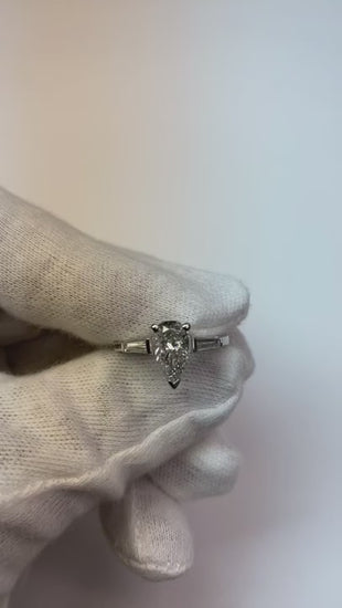 Stone Specifications: There is one pear cut diamond of approx. 1.51 carats (approx. size 8.7 x 5.7 mm) & 2 tapered baguettes of approx. 0.30 carats each. Natural earth mined diamonds.