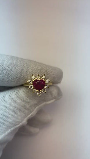 2.25 Carats Heart Cut Ruby And Natural Earth Mined Diamond Ring Yellow Gold 14K