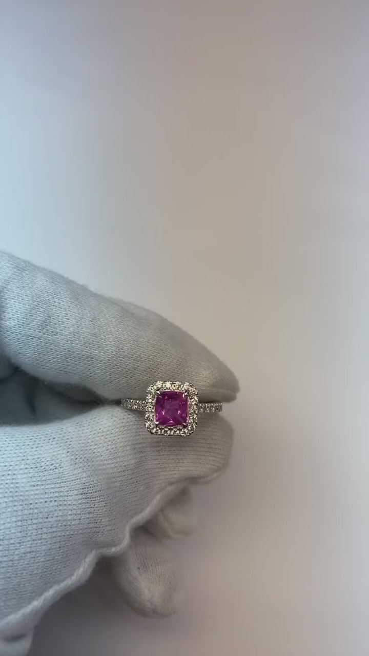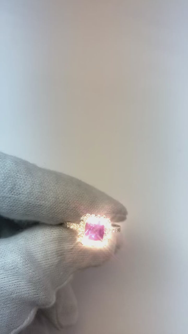 Stone Specifications: There is one pink sapphire in the center of approx. 1.00 carats & approx. 1.00 carats round smaller diamonds on the side. Natural earth mined stones.