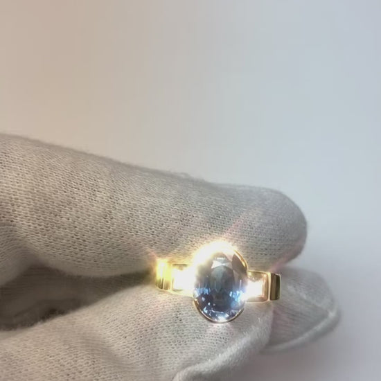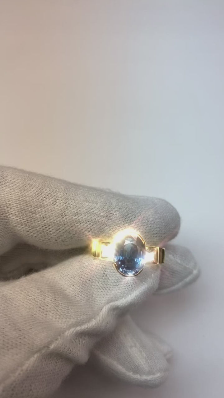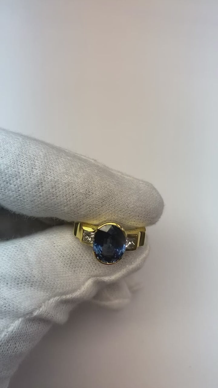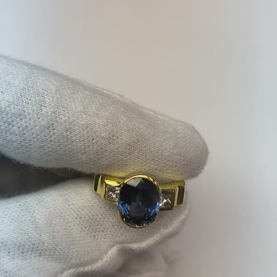 Stone Specifications : There is one blue sapphire in the center of approx. 3.01 carats (Approx. Size 11.4 x 7.5 mm) and 2 diamonds on the sides of approx. 0.30 carats each. Natural earth mined stones.