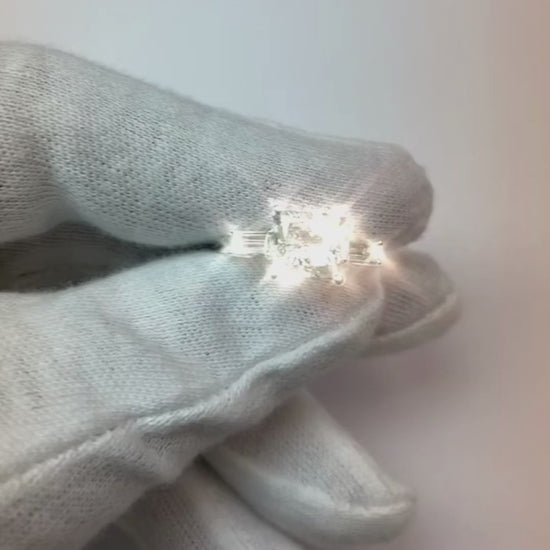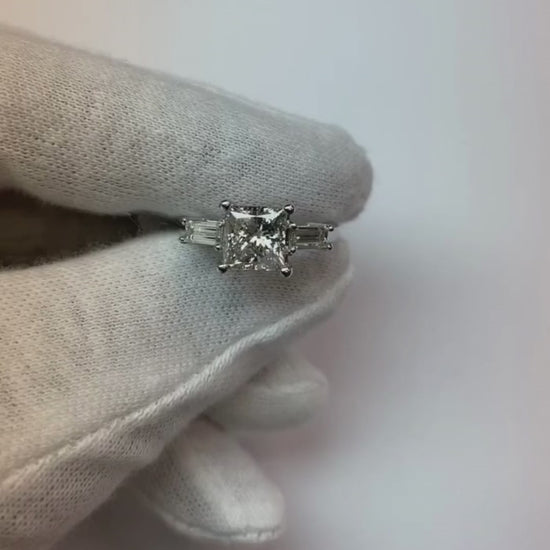Stone Details : There is one center princess cut diamond approx. 2 carats (Approx. Size 7.3 x 7.3 mm) and baguettes approx. 1 carat. Natural earth mined diamonds.
