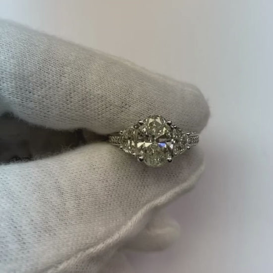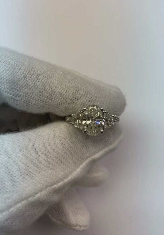 Stone Specifications: There is one oval diamond in the center of approx. 2.51 carats, two half moons on the sides of approx. 0.50 carats each and approx. 1 carat of smaller diamonds on the shank. Natural earth mined diamonds.
