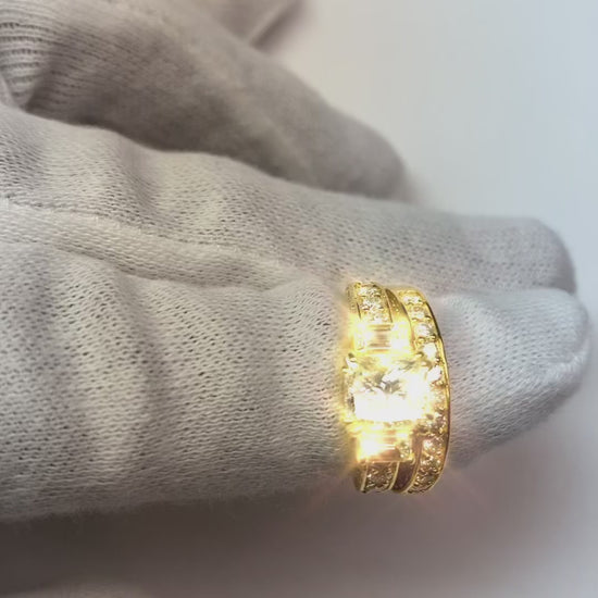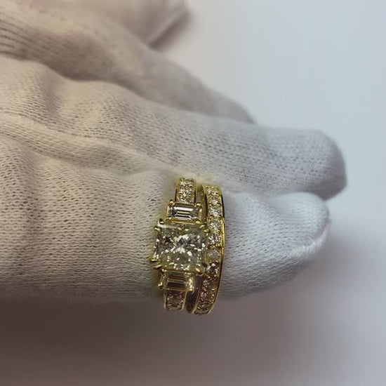 Specifications : There is one princess diamond in the center of approx. 2 carats, 2 emerald diamonds approx. 0.50 carats each & approx. 0.75 carats of smaller diamonds on the shank. There are approx. 1.25 carats diamonds on the band. Natural earth mined diamonds.