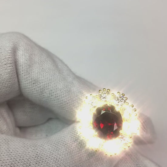 Stone Specifications: There is one garnet in the center of approx. 6.50 carat & approx. 0.75 carats round smaller diamonds on the side. Natural earth mined stones.