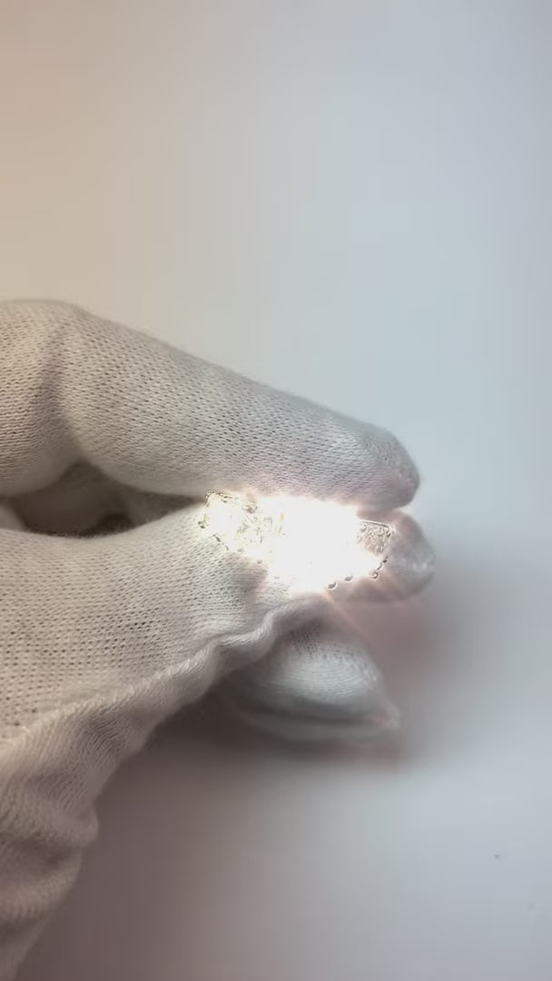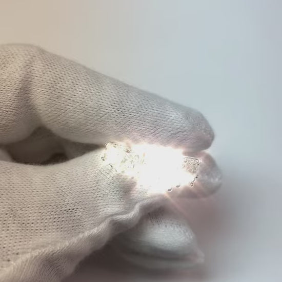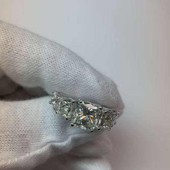 Stone Details : There is one cushion cut diamond in the center approx. 3 carats (Approx. Size 8.2 x 8.2 mm), two diamonds approx. 1.25 carats each (Approx. Size 5.7 x 5.7 mm), two diamonds approx. 0.50 carats each (Approx. Size 4.2 x 4.2 mm) and approx. 0.50 carats of smaller round diamonds on the sides. Natural earth mined diamonds.