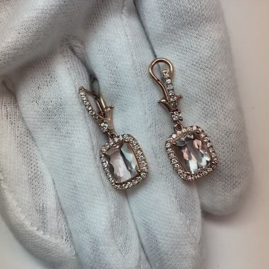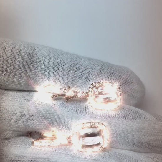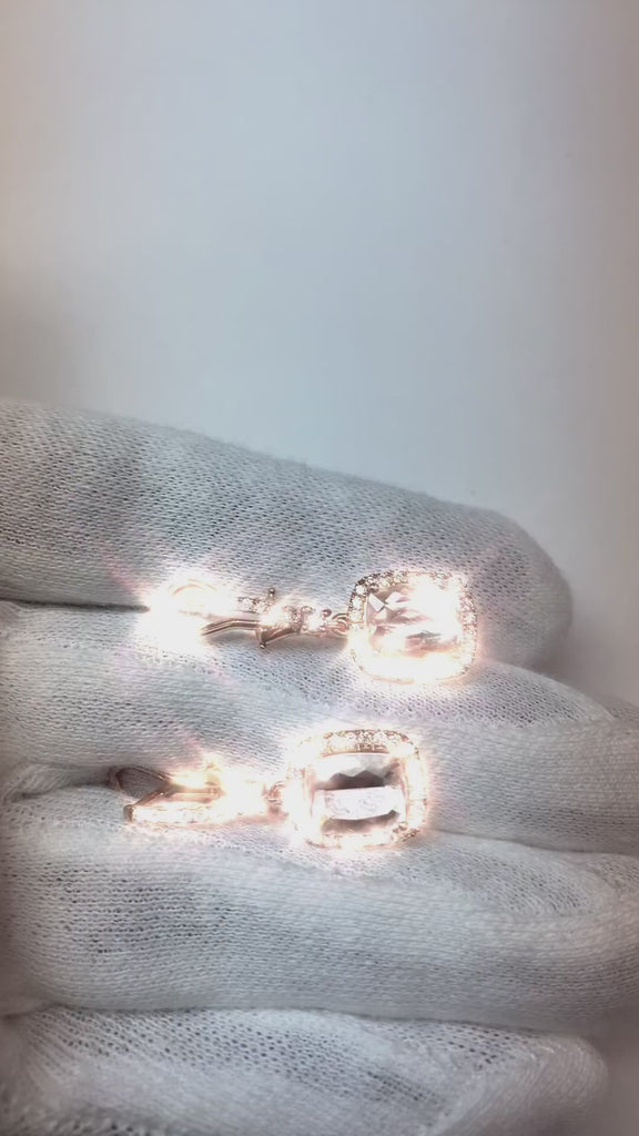 Morganite Cushion Earrings with small diamonds set in 14K Rose Gold. A stunning pair of earrings with a clear Morganite center stone surrounded by a delicate row of small white diamonds for a perfect finish. Enjoy wearing these earrings with their matching pendant, and be the envy of all. Match them with an elegant dress for a superb and hot look.