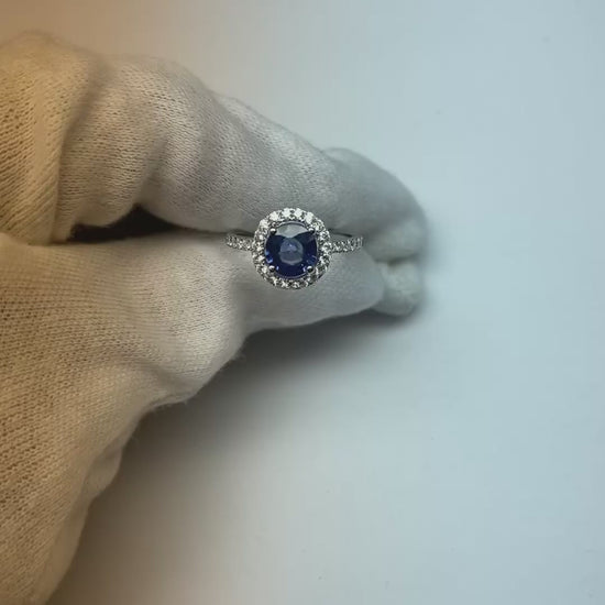 Stone Specifications: There is one blue sapphire in the center of approx. 2.50 carats & approx. 0.50 carats of smaller round diamonds on the side. Natural earth mined stones.