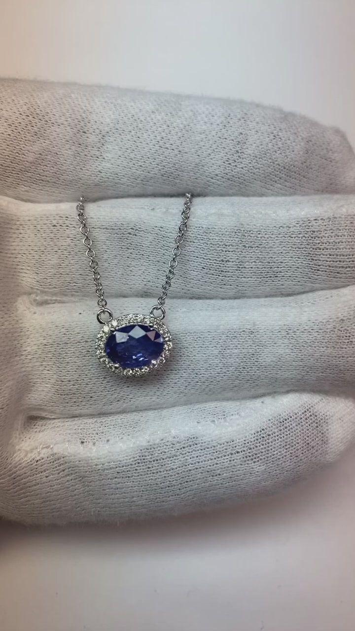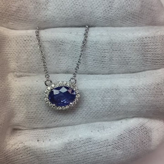 Stone Specifications: There is one blue sapphire in the pendant of approx. 2 carats (Approx. Size 9.9 x 6.5 mm) and approx. 0.50 carats round smaller diamonds on the side. Natural earth mined stones.
