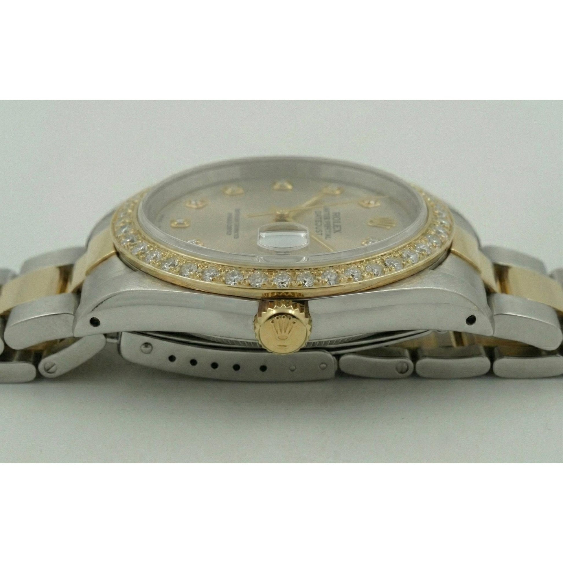 Rolex Oyster Perpetual Datejust model. Silver dial with diamond markers. 18K yellow gold bezel with bead set approx. 1 carats of very fine quality diamonds F VS1. Two tone oyster bracelet.