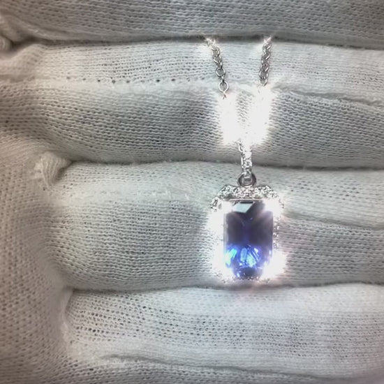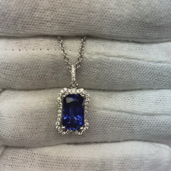 Stone Details : There is one emerald cut sapphire approx. 4 carats (Approx. Size 10.5 x 7 mm) and approx. 1.75 carats of smaller diamonds in the pendant. Natural earth mined stones.