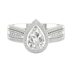 Gold Halo Old Cut Pear Natural Earth Mined Diamond Ring Triple Shank 4 Carats Milgrain