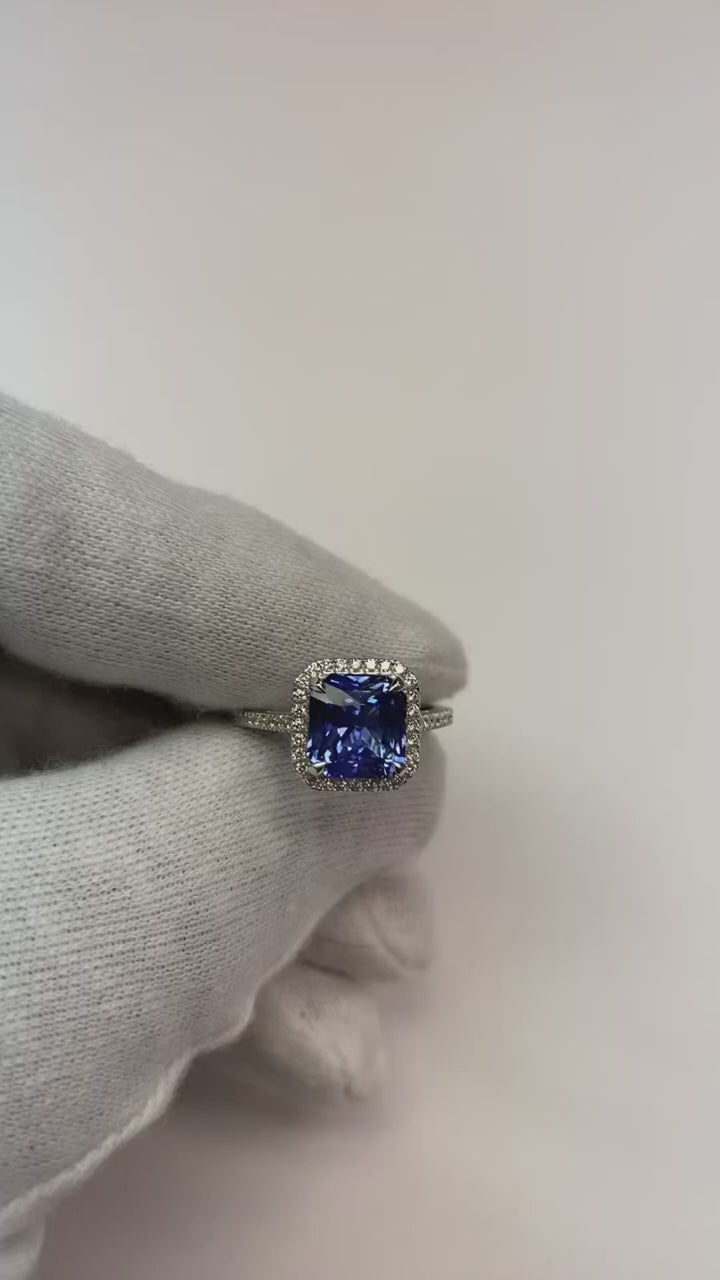 Stone Details : There is one radiant cut sapphire approx. 3.50 carats (Approx. Size 9 x 7 mm) and approx. 1.50 carat of diamonds on the sides. Natural earth mined stones.
