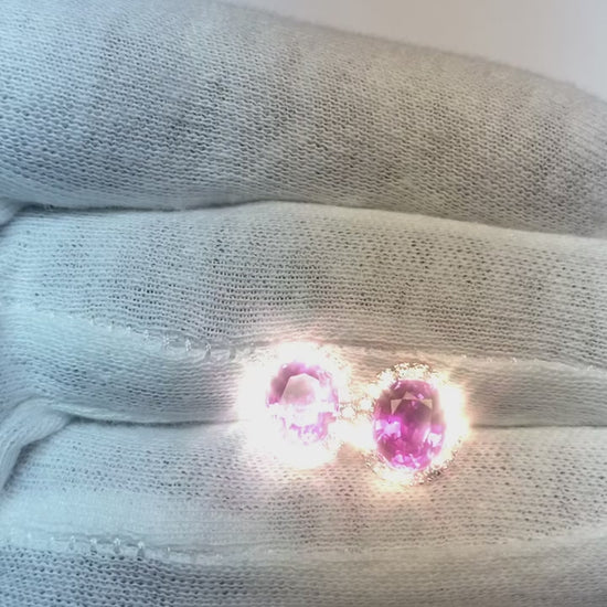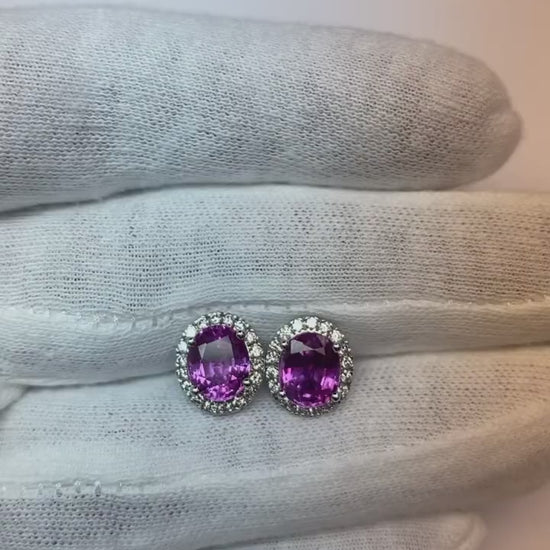 Stone Details : There is one sparkling oval cut pink sapphire in the center approx. 2.65 carats (Approx. Size 10.2 x 6.6 mm) surrounded by approx. 0.62 carats of round diamonds in each earring. Designed with natural earth mined stones.