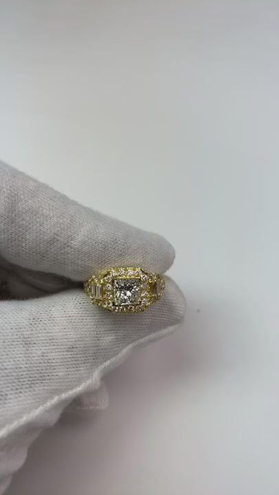 Stone Specifications: There is one princess cut diamond in the center of approx. 1.50 carats (Approx. Size 6.2 x 6.2 mm), 4 baguette cut diamonds on the side of approx. 0.25 carats each (Approx. Size 4.7 x 2.2 mm) and approx. 1.50 carats of smaller diamonds. Natural earth mined diamonds.