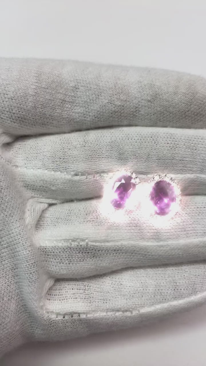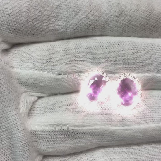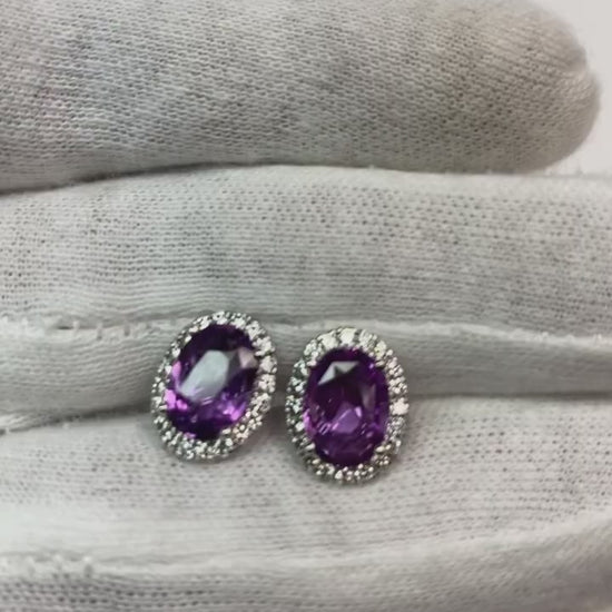 Stone Details : There is one oval cut purple sapphire in the center approx. 2 carats (Approx. Size 9.2 x 6 mm) with approx. 0.65 carats of smaller round diamonds along the sides, in each earring. Crafter with natural earth mined stones.