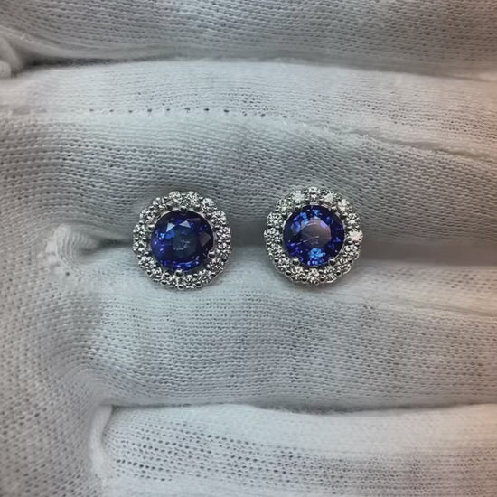 Stone Specifications: There is one sapphire in the center of approx. 1.50 carats (Approx. Dia. 7 mm) & 16 round diamonds on the side approx. 0.05 carats each (approx dia 2.2 mm) in each earring. Natural earth mined stones.