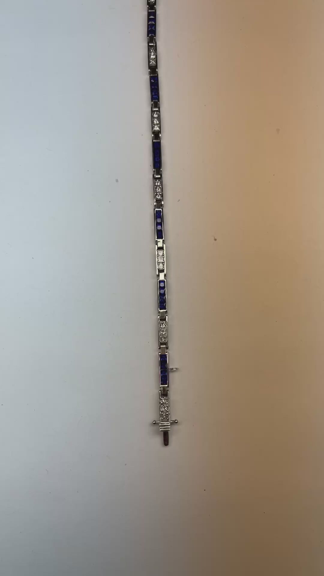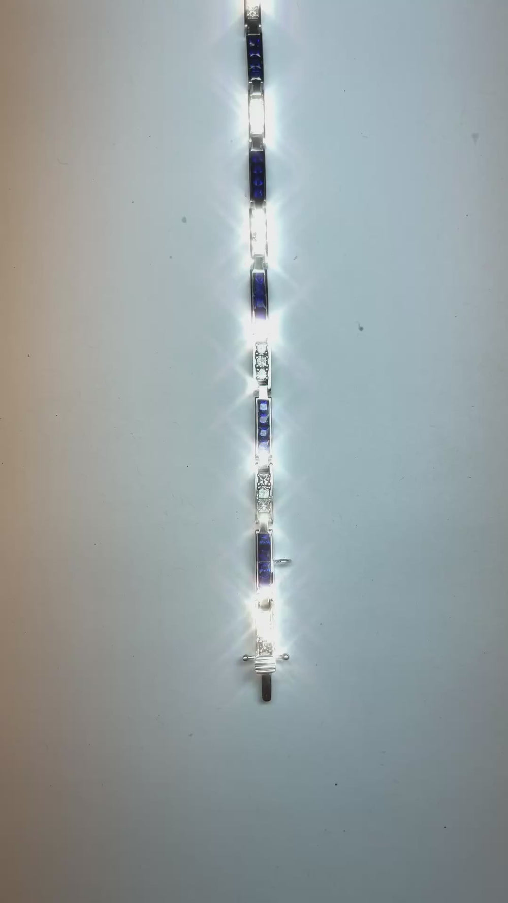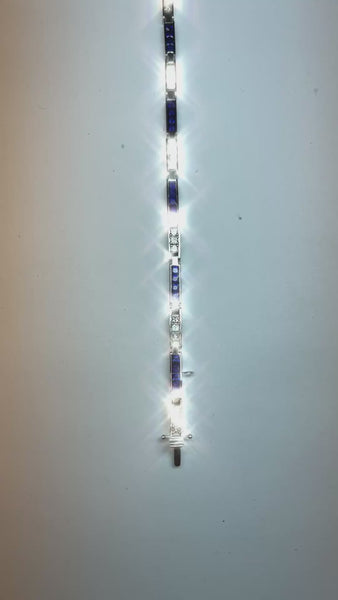 Stone Details : There are 21 Round diamonds approx 0.15 carats average size and 24 princess cut sapphires approx 0.20 carats average size. Natural earth mined stones.
