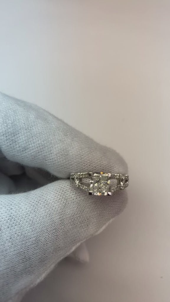 Stone Specifications: There is one cushion diamond in the center of approx. 1.15 carats (Approx. 5.9 x 5.7 mm) and approx. 0.75 carats of smaller diamonds on the shank. Natural earth mined diamonds.