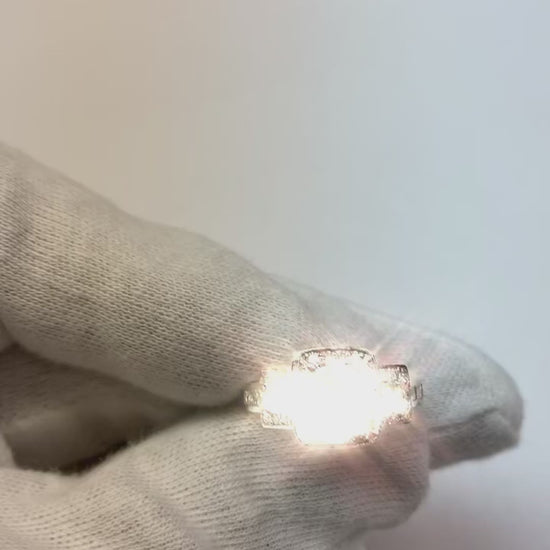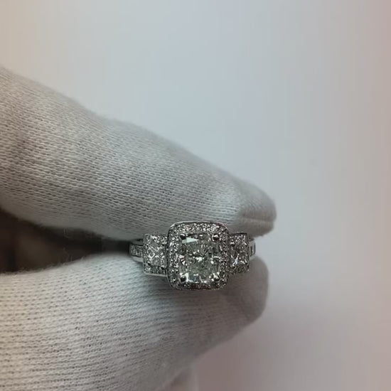Stone Details : There is one center cushion cut diamond approx. 1.50 carats (Approx. Size 6.3 x 6.3 mm), 2 princess cut diamonds approx. 1 carat, Baguettes on the sides approx. 0.50 carats and smaller round diamonds on the sides approx. 0.50 carats. Natural earth mined diamonds.