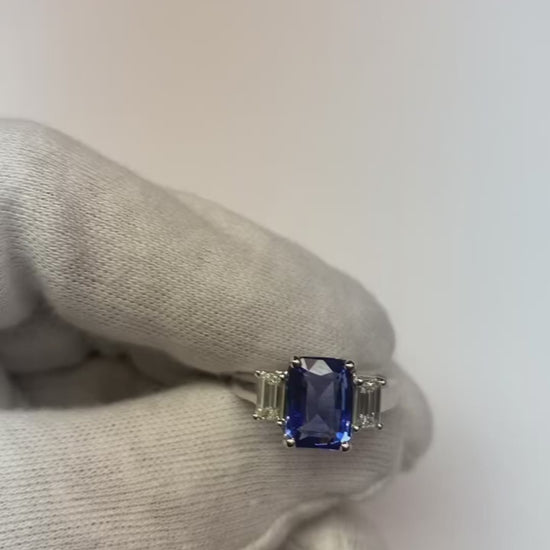 Stone Details : There is one radiant cut sapphire approx. 4 carats (Approx. Size 10 x 10 mm) and two emerald diamonds approx. 0.50 carats each (Approx. Size 4.9 x 3.6 mm) on the sides. Natural earth mined stones.