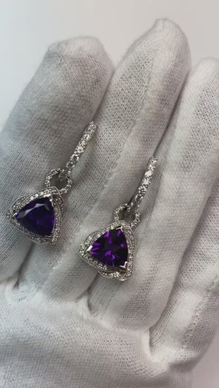 Women Dangle Earrings 5.10 Ct Amethyst And Natural Earth Mined Diamonds White Gold 14K